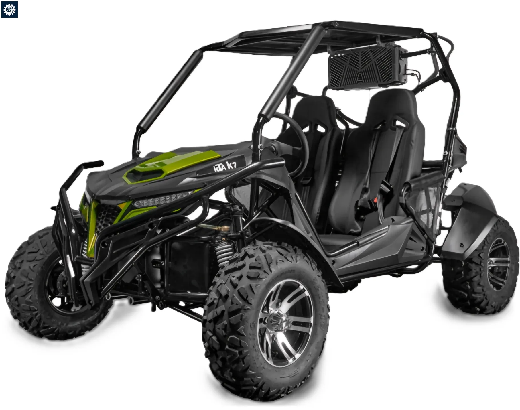 KTA K7X EFI — багги для настоящих приключений Ключевые параметры: Двигатель: 1-цил., 4-тактный, 280 см³ Мощность: 21 л.с Охлаждение: жидкостное Трансмиссия: вариатор (F-N-R) Макс. скорость: до 75 км/ч Тормоза: дисковые гидравлические (впереди и сзади) Топливный бак: 12 л Привод: задний Подвеска: усиленная, регулируемые амортизаторы Клиренс: 260 мм Шины: 21x7-R12 (перед), 22x10-R12 (зад) Размеры: 2340×1400×1550 мм Вес: около 300 кг Лебедка: в базе Панель: LED-спидометр Сиденья: анатомические, ремни безопасности Опции: герметичная приборка, текстильная крыша, алюминиевая защита Особенности: Актуальные обновления 2023 года Подходит для подростков и взрослых Проверена в условиях Карелии: отличная проходимость и контроль Эмоции, драйв и надёжность в одном корпусе KTA K7X — это багги, готовая к бездорожью, прыжкам, воде и грязи. Ваш маршрут начинается там, где заканчивается дорога.