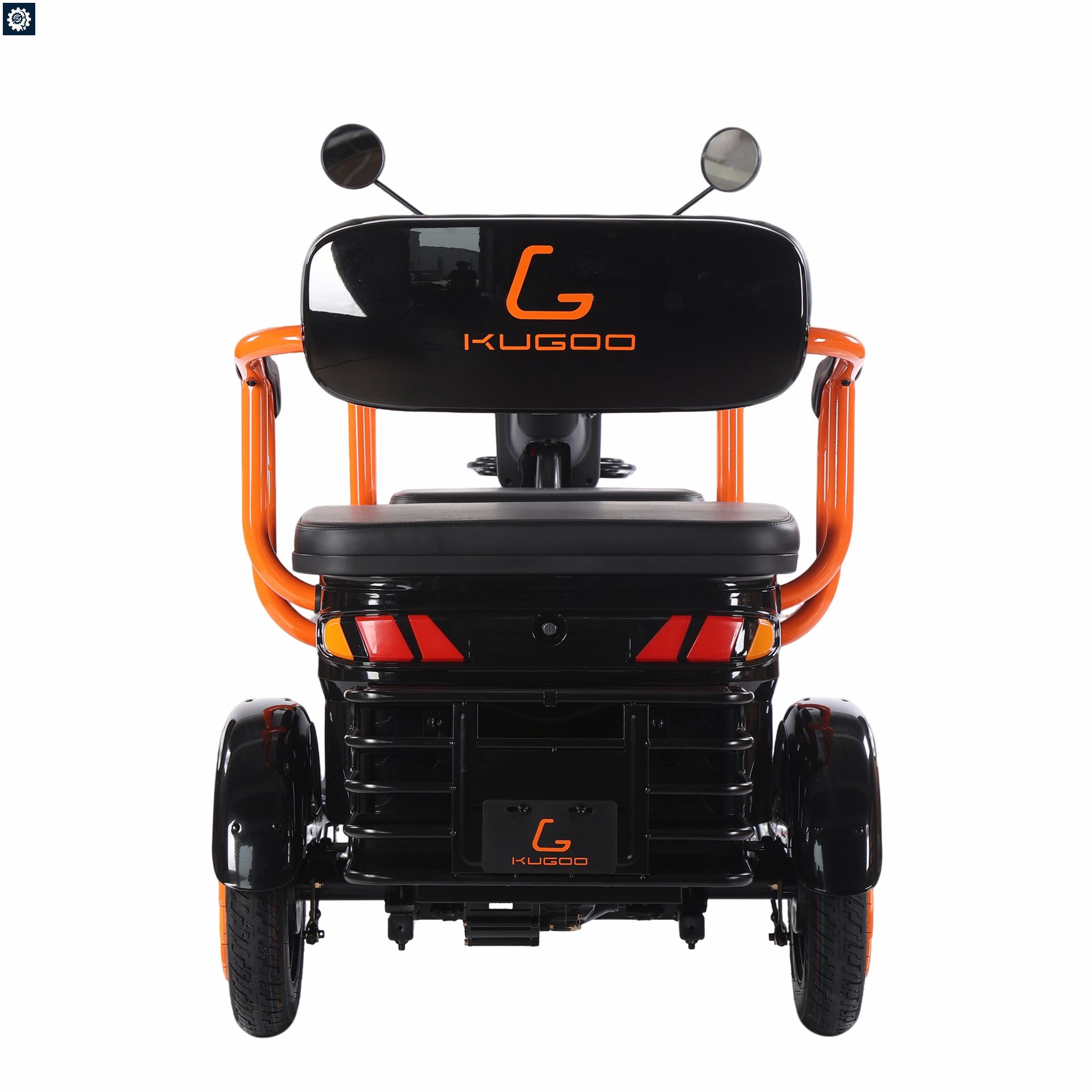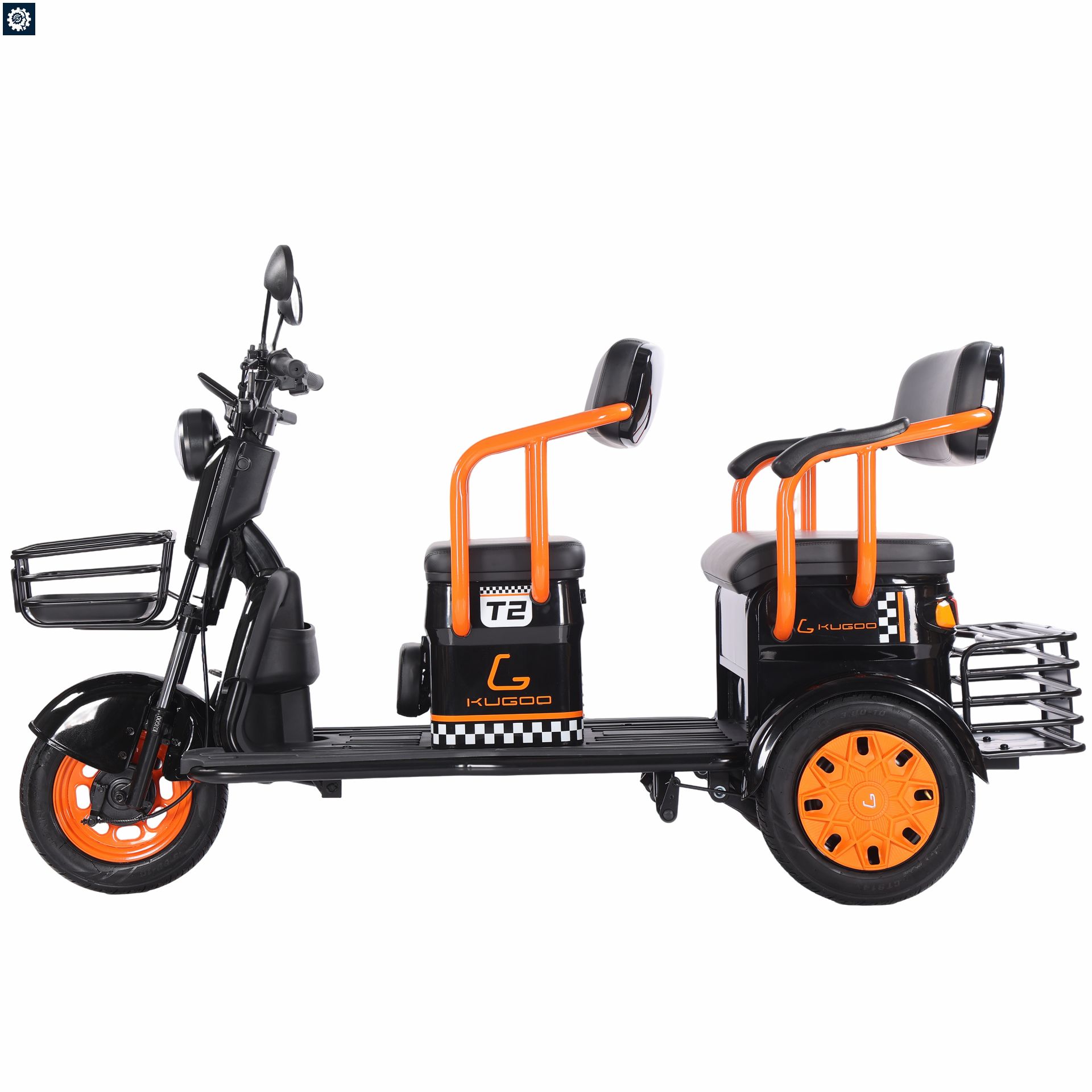 Kugoo T2 — трёхколёсный электроскутер с двигателем 500 Вт, аккумулятором 60V 21Ah (~1,26 кВт·ч) и запасом хода до 60 км. Максимальная скорость — 35 км/ч, грузоподъёмность до 150 кг. Оснащён двойной гидравлической подвеской, полной светотехникой и влагозащитой IP54. Идеален для города, работы и лёгких перевозок.