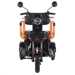 - Стильный и заметный дизайн: Сочетание классического чёрного цвета с яркими оранжевыми акцентами (Harlequin Orange) не только выглядит современно, но и повышает вашу пассивную безопасность, делая трицикл более заметным на дороге.