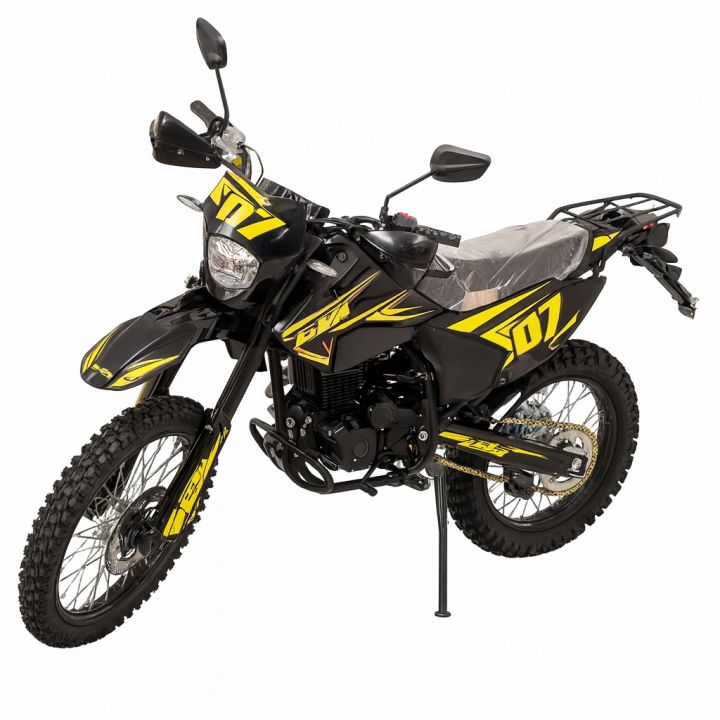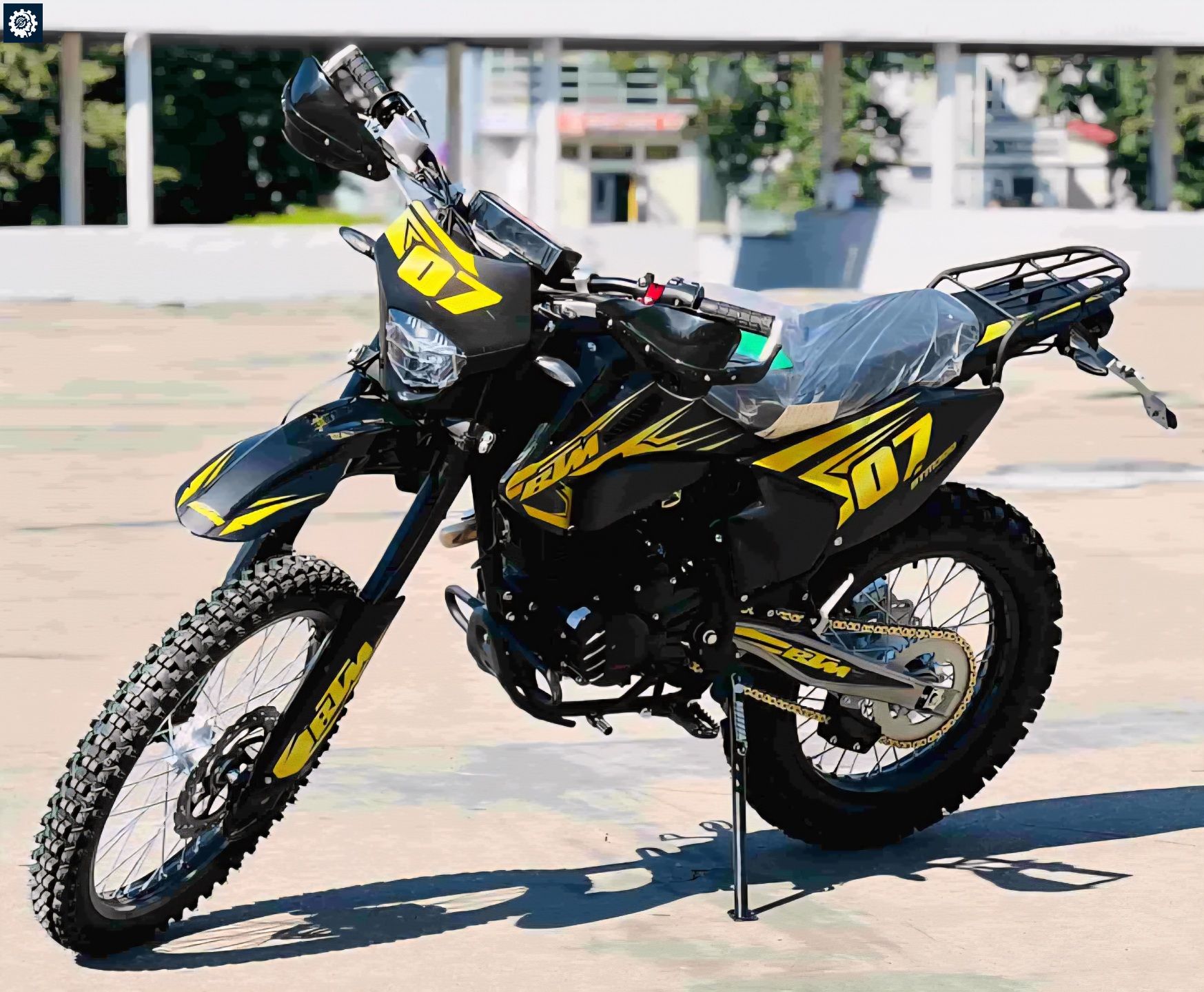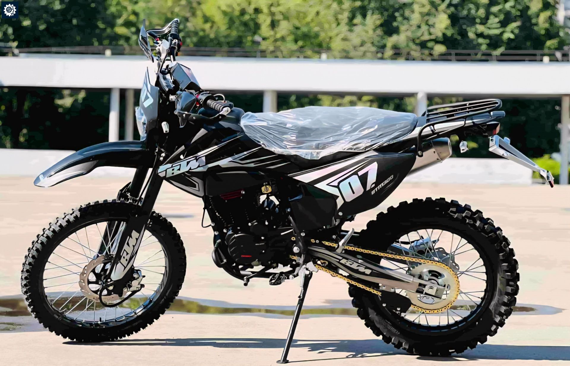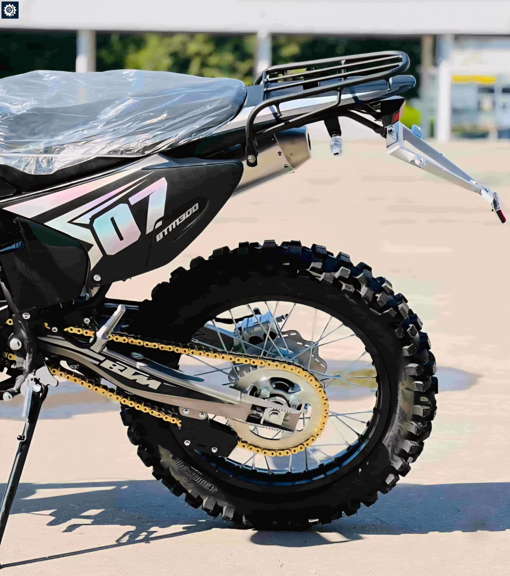 BTM Enduro 07 300cc Zongshen ZS 177F — спортивный эндуро-мотоцикл без ПТС, созданный для трасс, тренировок и бездорожья. Оснащён надёжным двигателем Zongshen 300 см³ (30 л.с.), 5-ступенчатой механической коробкой передач, карбюратором Nibbi и цепным приводом. Развивает скорость до 130 км/ч, потребляет всего 3–4 л/100 км и выдерживает нагрузку до 180 кг. Прочная стальная рама, подвеска с прогрессией, 21"/18" колёса и гидравлические дисковые тормоза делают его идеальным выбором для любителей экстрима.