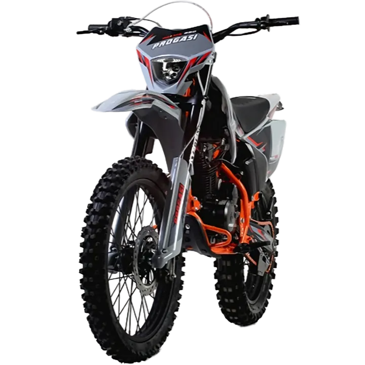 PROGASI Palma 250 — лёгкий и честный эндуро для тех, кто делает первый шаг в мир бездорожья. Двигатель ZS 172FMM-3A (CB250-F) выдаёт 23 л.с. и 18 Н·м, обеспечивая тягу «снизу» и контроль на подъёмах. Подвеска KYB-Tech и колёса 21"/18" с покрышками Kenda дарят устойчивость и проходимость. Вес всего 112 кг, клиренс 310 мм, высота по седлу 890 мм. Хромомолибденовая рама, короткоходная ручка газа, диодная оптика и приборка с тахометром. Оснащён цепью Choho, сиденьем Acerbis anti-slip и надёжным карбюратором PZ30. Создан для тренировок, хобби-гонок и выходных «в грязи».