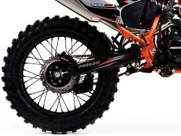 PROGASI Palma 250 — лёгкий и честный эндуро для тех, кто делает первый шаг в мир бездорожья. Двигатель ZS 172FMM-3A (CB250-F) выдаёт 23 л.с. и 18 Н·м, обеспечивая тягу «снизу» и контроль на подъёмах. Подвеска KYB-Tech и колёса 21"/18" с покрышками Kenda дарят устойчивость и проходимость. Вес всего 112 кг, клиренс 310 мм, высота по седлу 890 мм. Хромомолибденовая рама, короткоходная ручка газа, диодная оптика и приборка с тахометром. Оснащён цепью Choho, сиденьем Acerbis anti-slip и надёжным карбюратором PZ30. Создан для тренировок, хобби-гонок и выходных «в грязи».